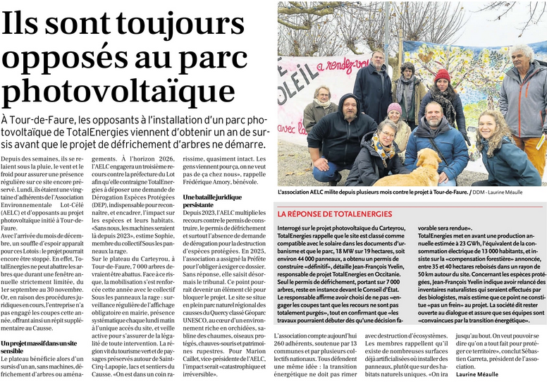 - La Dépêche : « Un deuxième parc photovoltaïque à Tour-de-Faure ? Les opposants interpellent les parlementaires du Lot » (22/02/2024)