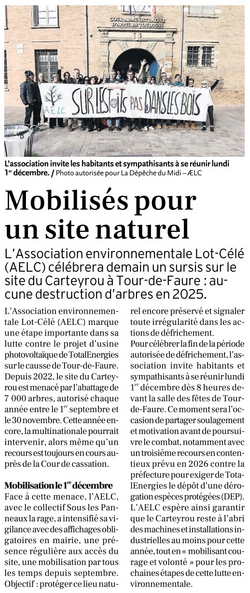 - La Dépêche : « Tour-de-Faure : une audience décisive pour les opposants au projet de la centrale photovoltaïque de TotalEnergies » (07/11/2024)